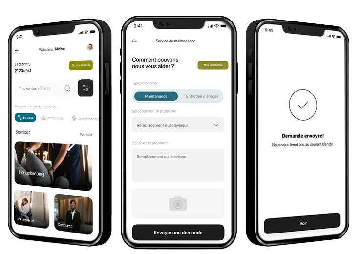Nos clients bénéficient d'une application privée (Guest App) pour interagir à tout moment avec 212Guest et réserver leurs services en toute simplicité